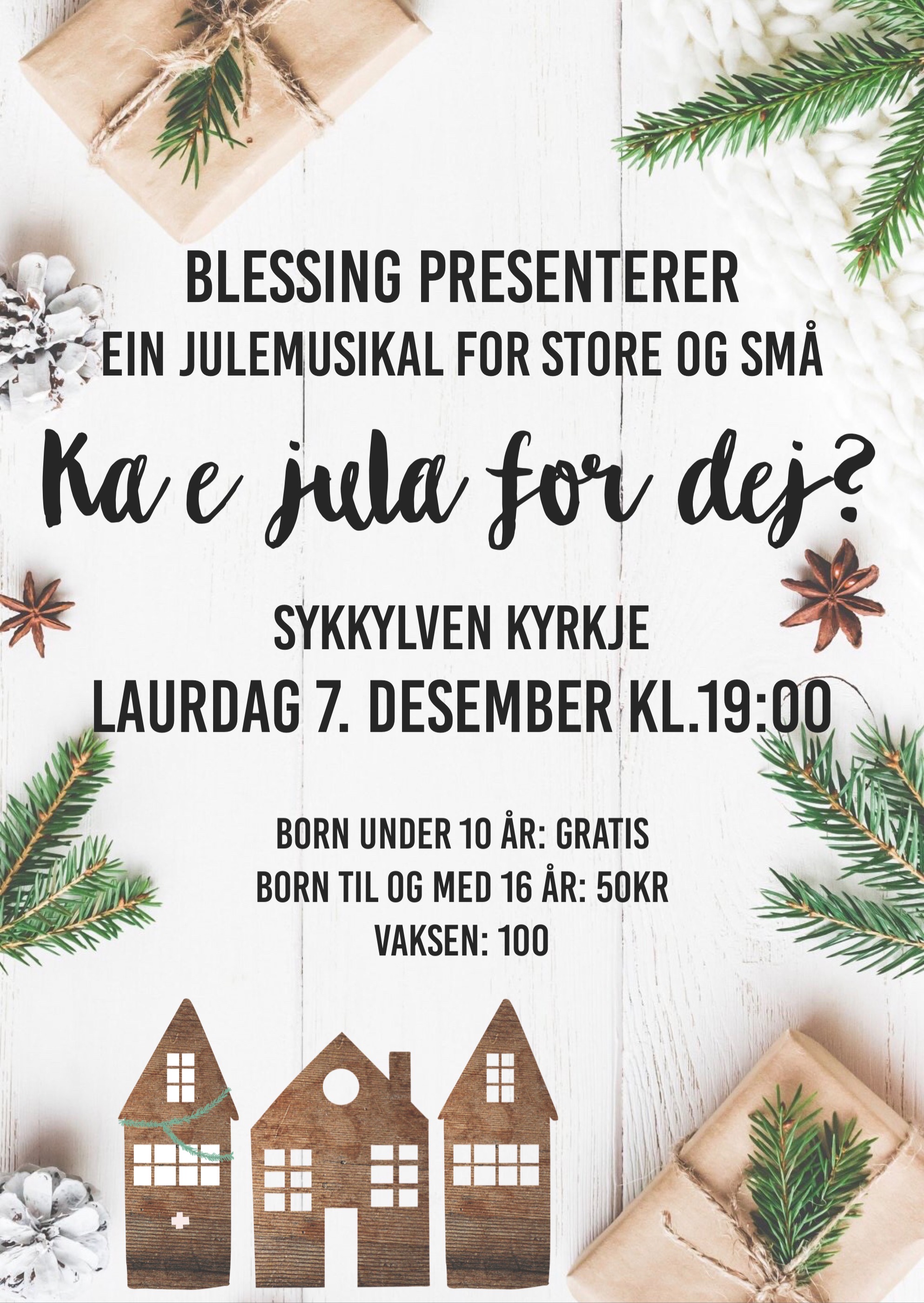 Ungdomskoret BlesSing har i haust skreve eiget manus til julemusikalen "Ka e jula for dej?" Du vil få høre kjente og kjære julesongar, og vi vil få sjå korleis jula kan sjå ut heime hos ulike menneske som vi møter i musikalen.
